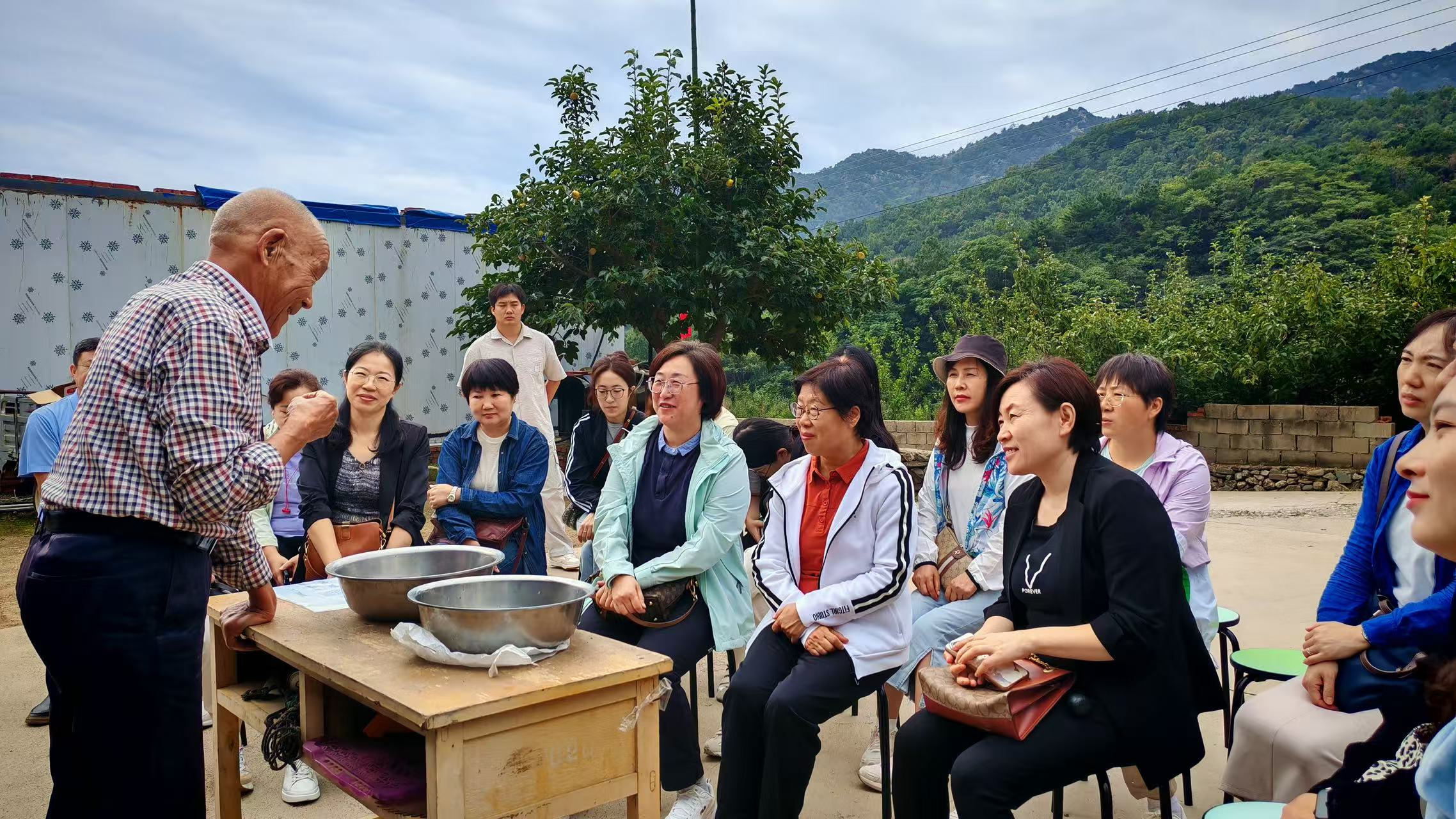 抵达基地后,吕景伦老人首先与大家分享了自己的奋斗故事。今年80岁的吕景伦,1964年入伍,在部队期间多次荣立二等功、三等功,将青春热血奉献给国防事业。1999年退休后,他并未停下奋斗的脚步,而是选择“上山拓荒”,带领周边农民历经20余年艰辛,在2000多亩荒山上建成两处花果园,让昔日荒坡变身烟台市最大的冬枣基地。凭借这份坚守与付出,吕景伦先后获评“烟台市老有所为先进典型”“烟台国际果蔬博览会果王”,2024年更荣获“全国离退休干部先进个人”称号。老人朴实的话语中满是坚韧,生动的奋斗故事打动了现场每一位老师,大家深刻感受到一名老兵退休不褪色、离岗不离责的担当,以及“愚公移山”般的执着与毅力。随后,老师们实地参观了百果园。漫山遍野的果树郁郁葱葱,挂满枝头的果实展现着丰收的希望,大家边走边看,亲身感受这片土地从荒山到“宝地”的蜕变,更直观地理解了吕景伦老人“拓荒奋斗”精神的实践意义。