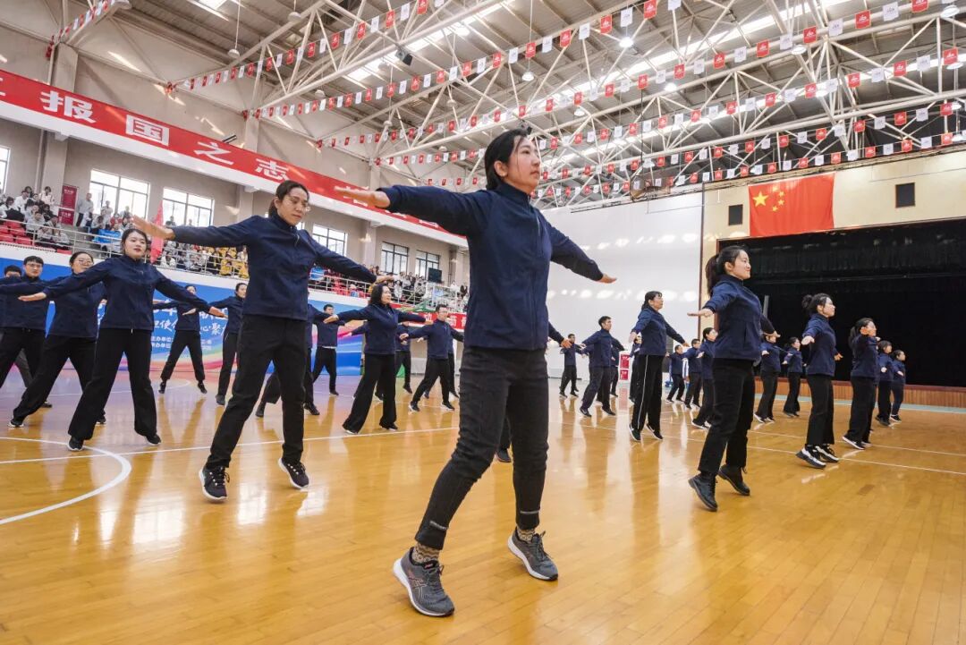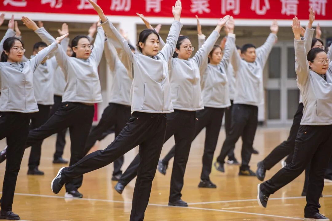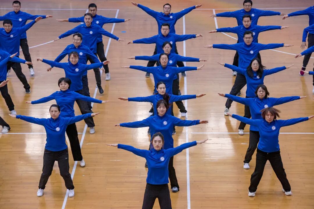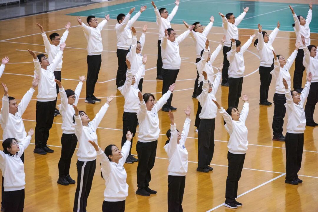 开幕式上,党委副书记白青宣布比赛开幕。伴随着悦动的音乐旋律,花球啦啦操表演燃动全场,展现了青年学子的青春活力。比赛现场气氛热烈,各代表队身着统一服装依次登场。本次大赛分为第九套广播体操和八段锦两个类别,参赛教职工精神饱满,动作规范整齐、娴熟流畅,队列整齐划一,成员间默契配合,每一个抬手、转身动作都利落标准,展现出广大教职工自信、自强的风采。评委组围绕“动作协调性”“精神面貌”“整体表现力”的核心维度进行综合打分,全程严守评审准则。
