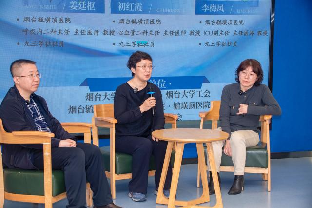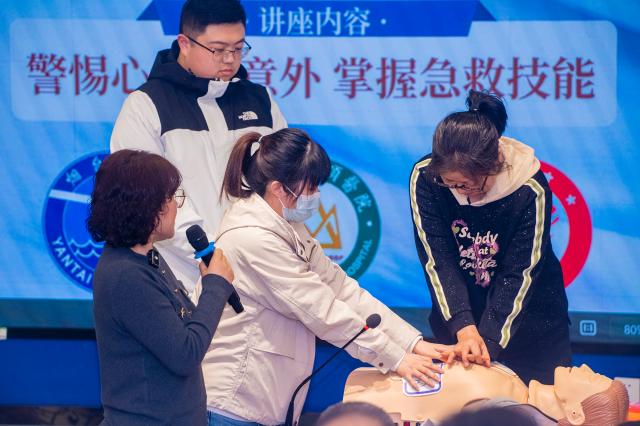 为普及健康知识,倡导健康生活方式,提高师生自我防护意识与应急处置能力,3月29日,九三学社医疗专家医学健康科普校园行2026年公益讲座第一站走进我校。九三学社社员、烟台毓璜顶医院心血管二科主任初红霞教授、呼吸内二科主任姜廷枢教授、ICU副主任李梅凤教授为师生开展了一场兼具专业性与实用性的健康公益讲座和实操培训,活动同步开启线上直播。九三学社烟台市委会副主委张桂德、烟台大学党委常委、统战部部长毕朝辉出席,校工会主要负责人及师生代表参加活动。